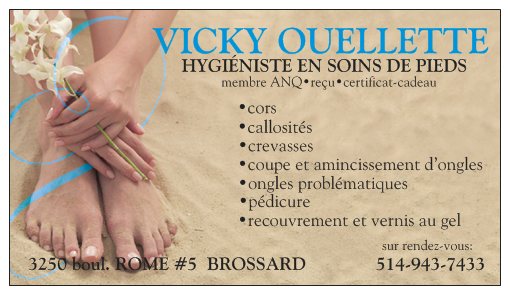 Vicky Ouellette, hygiéniste en soins de pieds, vous propose une heure de soins de pieds pour venir à bout de vos callosités, soulager vos cors ou simplement une pédicure rafraichissante pour vos pieds. Un reçu pour vos assurances privées vous sera remis après le soin de pieds.